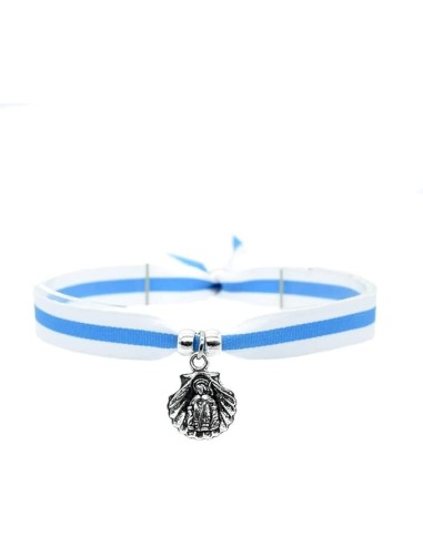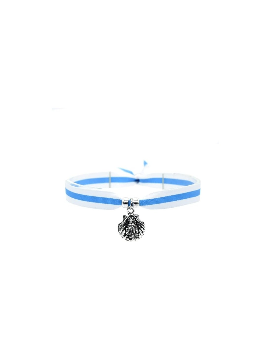 Lleva contigo el símbolo del Camino de Santiago con esta hermosa pulsera de peregrino inspirada en la tradición jacobea. Diseñada con una cinta de tela en tonos azul y blanco, esta pulsera incluye un colgante de concha de vieira metálica, representando la protección y guía de Santiago Apóstol.